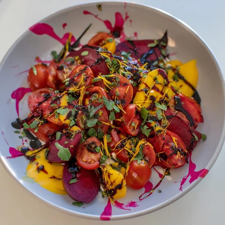 There's real science behind why this salad feels so stunning. The red tomatoes and radishes create energy, the golden beet and watermelon add warmth, the greens provide visual rest, and the white feta acts like highlights in a painting. When you arrange them with intention—not in neat rows, but in that intentionally wild pattern—your eye travels across the plate with genuine pleasure. I learned this by spending time looking at actual abstract expressionist paintings and asking myself, 'What makes this composition work?' It taught me that chaos still needs a bit of structure beneath it.