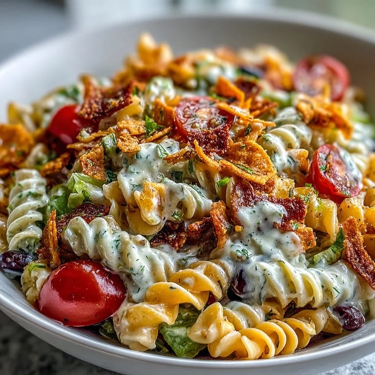The beauty of this salad is that it's forgiving enough to take your substitutions seriously. If you want to add protein without changing the whole vibe, crumbled cooked ground beef or shredded rotisserie chicken disappears into the salad like it was always meant to be there. Greek yogurt can replace some or all of the sour cream if you want something lighter, though the dressing will taste slightly tangier. Even switching to gluten-free pasta works seamlessly—just make sure you rinse it extra well because some gluten-free varieties release more starch.