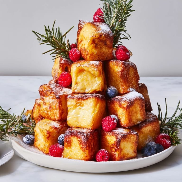 Pin it Festive, bite-sized French toast cubes infused with creamy eggnog, stacked into a charming tree shape—perfect for holiday brunch gatherings.