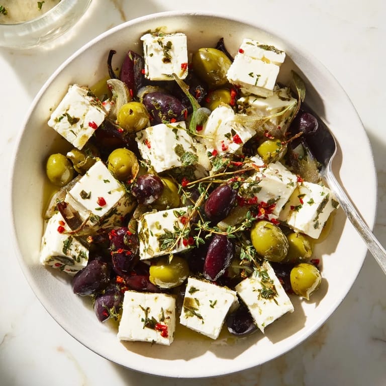 Pin it A vibrant and festive appetizer featuring a medley of marinated olives and creamy feta cubes, perfect for entertaining and holiday gatherings.