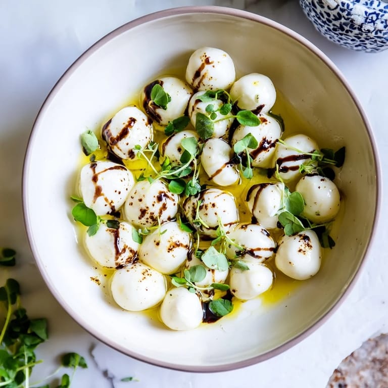Pin it A fresh and delightful appetizer or snack featuring creamy mozzarella pearls lightly seasoned and served in a small bowl.