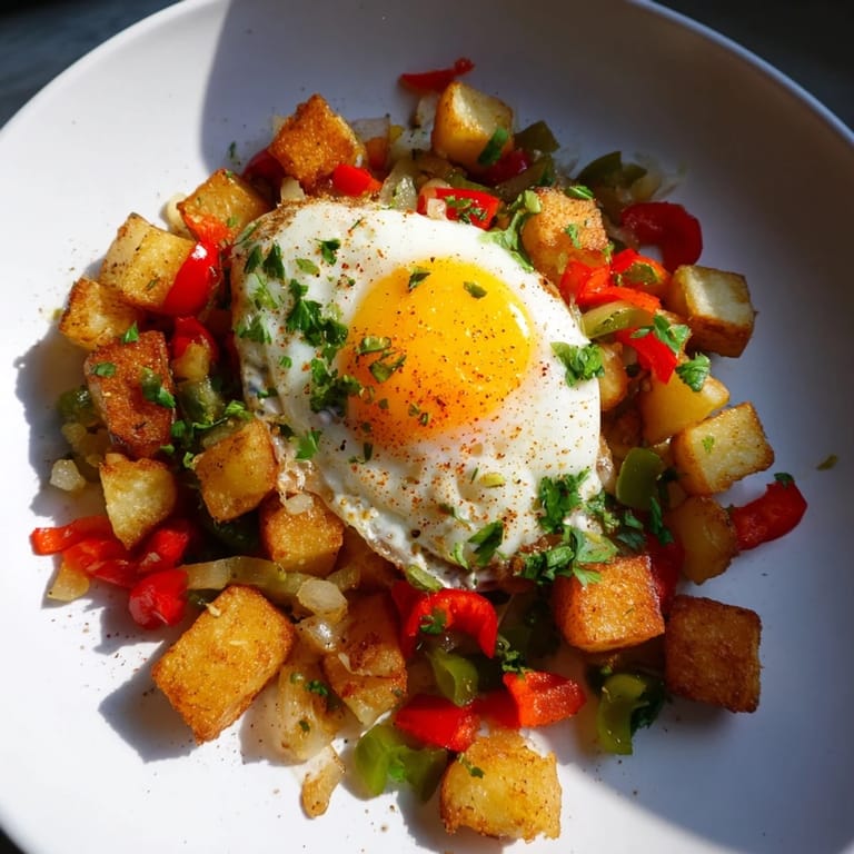 Pin it A comforting, rustic one-pan meal featuring golden potatoes, sautéed vegetables, and perfectly cooked eggs—ideal for a quick weeknight dinner or hearty breakfast.