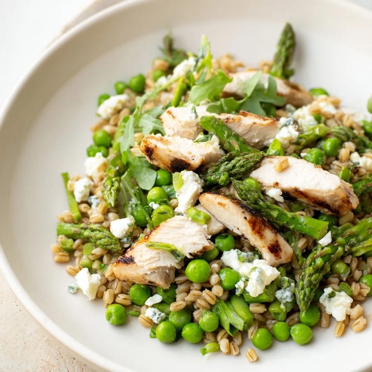 - In a large bowl, combine cooked farro, chicken slices, blanched asparagus, peas, and arugula or spinach. Drizzle with vinaigrette and toss gently to coat.